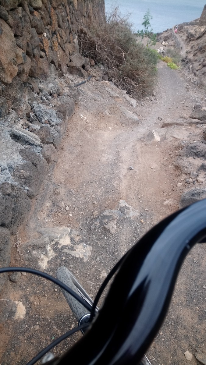 Op de mountainbikes gaan we naar huis. Het echte werk. Nu we de mountainbike hebben kiezen we voor de gewone weg. Echt waar. De wind waait ons bergaf en bergop. We hoeven alleen maar te remmen. Tot aan het laatste stuk, dat gaat zo: