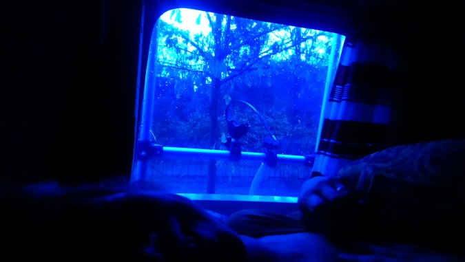 In een mooie stad tillen we dozen, trappen af, het huis uit, een huis in. Voor de nacht hebben we een mooie plek op het oog, nog even rijden. De tomtom ligt nog thuis, en onze mobieltjes hebben geen internet. We krijgen een Belgische symfonie van te volgen plaatsnamen mee: Rijkvorsel, Wuustwezel, Achterbroek. Zonder problemen swingen we de juiste camperplek op. Zonder ruzie, die bij de tomtom altijd wel ingeprogrammeerd is. We mogen hier met vier campers staan, wij zijn nr. zeven. We blijven toch. De regen valt, zoals het hoort. Ik slaap nergens zo goed en gelukkig als in de camper. Ook al is ze wat verroest, mijn liefde is groot.