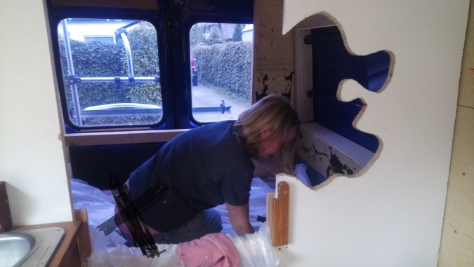 ’s Middags kan het opbouwen beginnen. Schilderen met grondverf, het plafond en de grote slaapkamer.