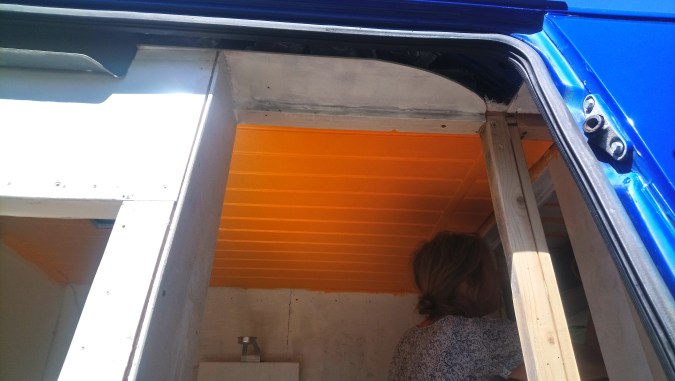 Ondertussen en ondanks is de zomer losgebarsten. We hebben er aan bijgedragen: in verloren uren ons camperplafond in het beloofde abrikoos geschilderd.