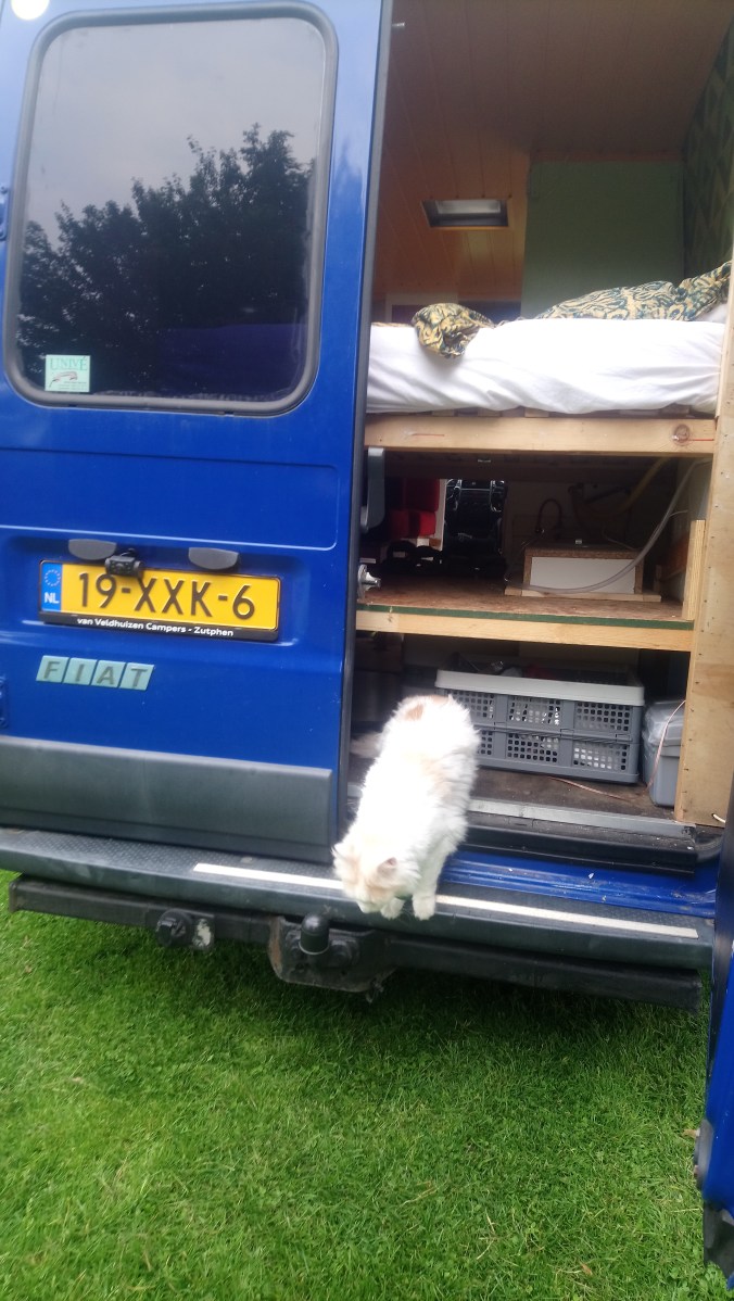 Na nog wat paardengeluk hebben we de camper ingericht. We gaan weer met zijn allen op vakantie. Ricky weet al niet beter. Maar de katjes gaan pas voor de tweede keer mee. Ze hebben nu allebei een mobieltje, met een abonnement erbij. Als ze de weg kwijt zijn kunnen ze appen. Zo goed voorbereid, gaan we gerust op pad. Bij aankomst springt Lucius gelijk de wijde wereld in. Tarq wil eerst een kauwstaafje voor hij uit een diepe camperkrocht tevoorschijn komt. Maar dan: