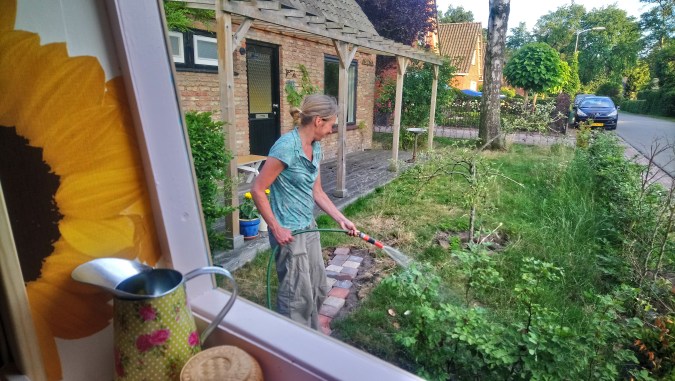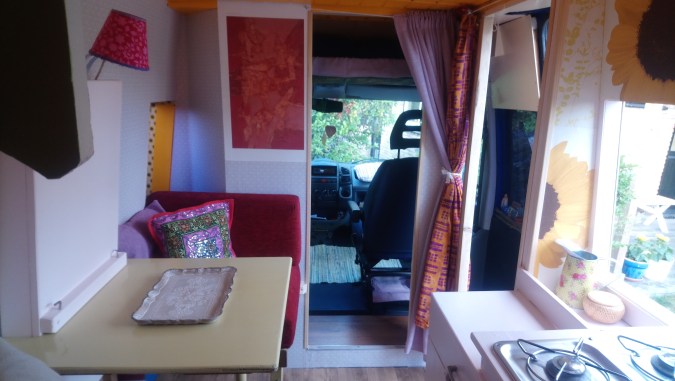 De keukenkastjes in de camper zijn op orde. Nepkoffie met kurkuma-smaak (echt waar, en zéker geen aanrader, maar zo duur dat ik wel verder drinken moet) en hagelslag. We kunnen bijna weer vertrekken, het bedje lokt al weer aan: