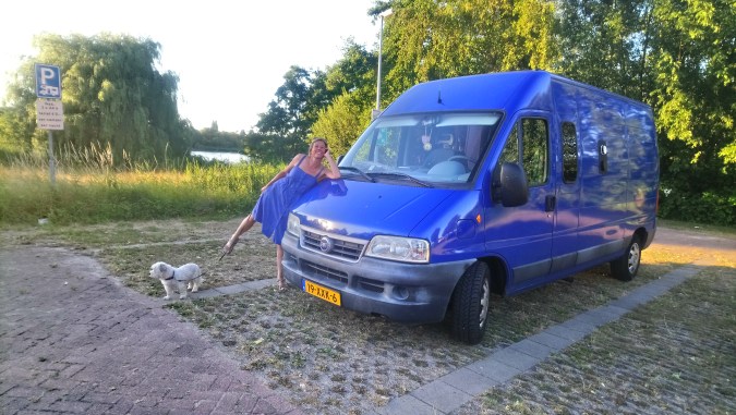 We zijn op zoek gegaan naar een studeerplek voor mij. Morgen examen. Een idyllisch, rustig plekje aan een riviertje. Dan kan Tillie, in de warmte, steeds even onderduiken. We rijden het dorpje binnen. Vrouwen met hoedjes, meisjes ook, jurken, pakken. Een kerkdorpje. In kerken is het ook goed studeren. En we zijn in onze jurken vandaag. Maar daar belanden we niet: we zitten nu aan de rand van een hondenuitlaatgebied. De dj heeft een stevig muziekje voor ze opgezet. Er is nog een vogeltje wat er boven uit wil. Gelukkig is er een terrasje aan de overkant. Daar ga ik morgen zitten leren. Ik mag weer koffie hè.