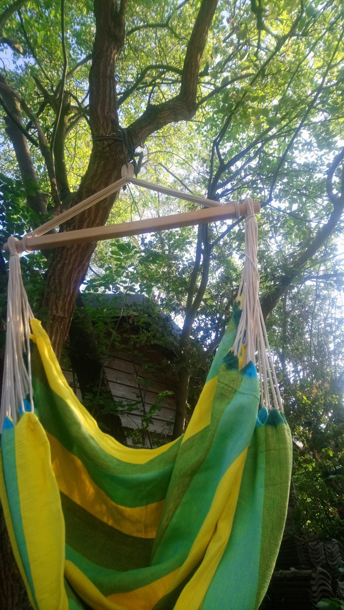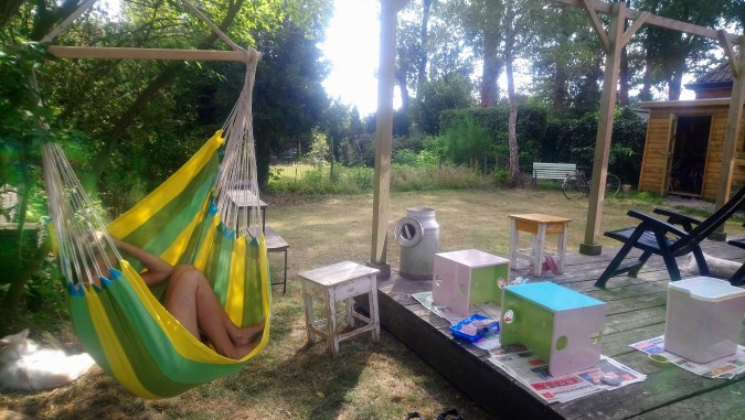 Het camperleven staat stil. We werken wat, we bbq-en veel. We reviseren zaken, zoals het grasveld en heggen (o nee, dat laatste doet de buurman). Ook snoeien we de topjes van het onkruid af, het moet onze tuin blijven. In Amsterdam heb ik ooit een hangmat gekocht bij de wereldwinkel. Decennia terug, in de tijd dat de prijs over de 150 gulden lag en met zonder tuin of balkon erbij. Nu hangt hij. Uit de verpakking gehaald blijkt het een zitmat. Wat een geluk kan zo’n ding geven. Tillie verheugt zich op de ontbijtjes die erin volgen. Maar wanneer je erin zitten gaat, slaap je snel. Wie wil er nog een campertje, wij blijven thuis.