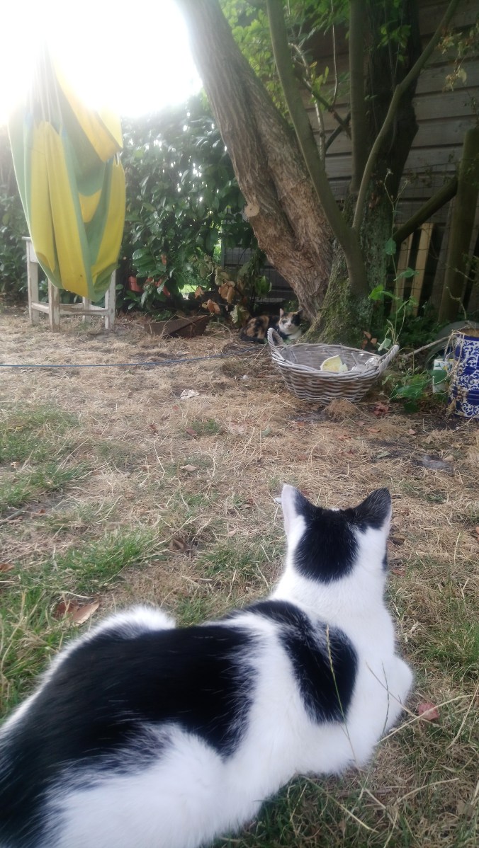 Ik kan haar zelf niet ontdekken op de foto. Wie weet jullie wel. We konden haar evenmin naar beneden lokken. Dus haar hele gezinnetje kwam weer terug om te roepen en te smeken, te voeren en te klimmen, de kosten van de brandweer te googlen en een hele lange ladder te regelen. We zijn maar gaan zitten en haar vrouwtje is haar uit de boom gaan kijken. Dat heeft gewerkt. Nu is kittie samen met het snackhapje in de woonkamer. Hebben ze de ruimte voor zichzelf. Kan Kittie haar verhaal kwijt aan haar huisgenoot, voor de hoognodige “unwinding”. En het hamstertje, op zijn beurt, hoort aan en ziet een mogelijke vluchtroute in het verschiet, die mij fotografisch helemaal laat zwemmen. Maar eerst even een appje aan de familie: gb en goeie reis!