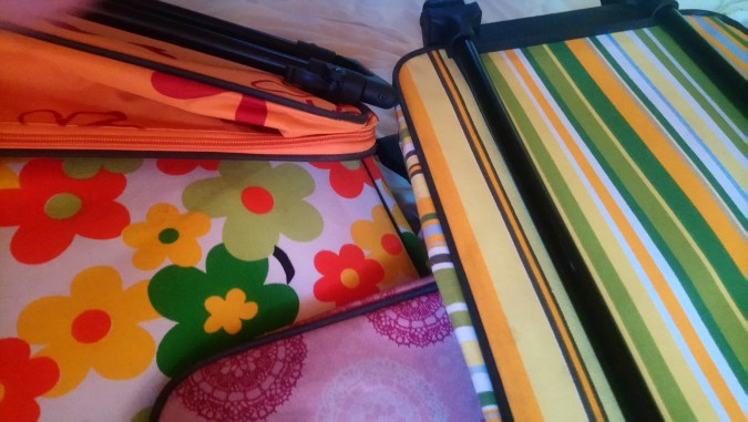Na de kennismaking duiken we nog even het naastgelegen vogeltjesmarktje op. Dieren hebben ze niet hoor, tijdens deze hittegolf. Wel heel veel tassen. Ik zie een rolkoffertje met een gezellig retro-dessin. Meer iets voor in het vliegtuig dan in de camper, maar zo leuk, dat ik ik ‘m toch wil. Ik scan de dessins. “Waarom neem je ze niet allemaal?” spoort de koopman me aan. “‘ t is geen geld, jij blij ik blij, en als je wilt: ik heb er nog duizend liggen”. Het gaat even door me heen, allemaal… Dat je dat zomaar zou kunnen doen. Dan doe ik het en nu heb ik ze. Geen 1000 hoor. Maar een dozijn met een leuk dessin.