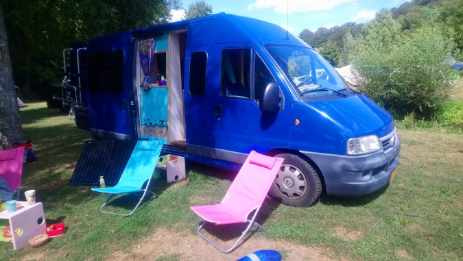 Wat ze dus wel hebben in België naast die mooie natuur, is wielerrondes. Zo’n tien kilometer voor de camping zijn de wegen daarom afgesloten. De tomtom blijft herberekenen zonder dat er een oplossing op het scherm verschijnt. We zijn aan onszelf overgeleverd. Wegen vernauwen, worden zandpaden. Dan een vallei zonder overbrugging, draaien moeten we. Een vrolijke verdwaling, zonder stress en ruzie. Prachtige hobbelpaadjes