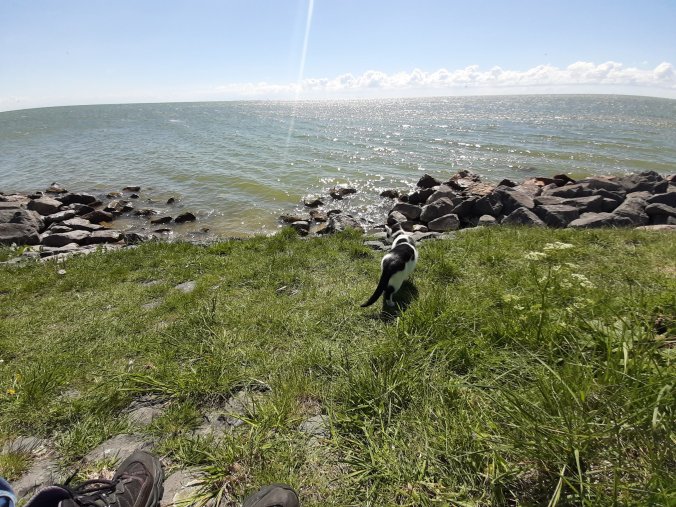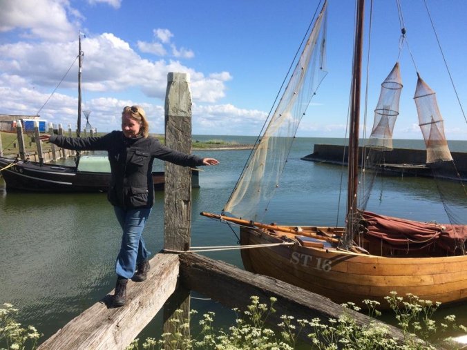 Tillie, Rotterdams als ze is, voelt zich in elke havenstad thuis. Ook hier in Laaxum, waar de gehele aanwezige vloot op de foto aangemeerd ligt. Daar vangen ze de vette kibbelingen mee, die we met paprikapoeder en cola in het barretje kopen en weg laten glijden. Waarom gaan we nooit in Rotterdam zelf kijken? Dat komt door deze twee snuiten: