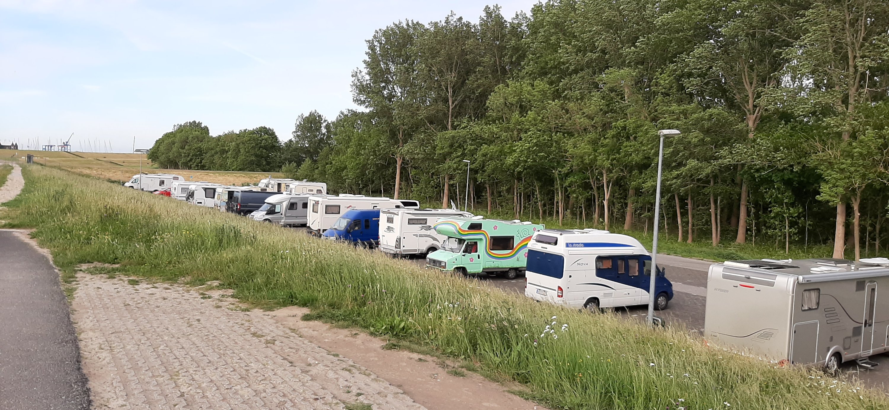 Het is nog vroeg, maar mijn rust begint al want we houden de jongens binnen. De camperrij dikt allengs aan tot een veelvoud van wat op de foto te zien is. En het zou een avondje aanbellen worden bij al die camperaars, op zoek naar Tarqui en Luus, als ze vrij rond mochten lopen. Dat aanbellen doen we morgen wel weer, dan hebben we een plek alleen op het oog.