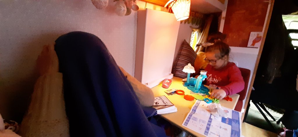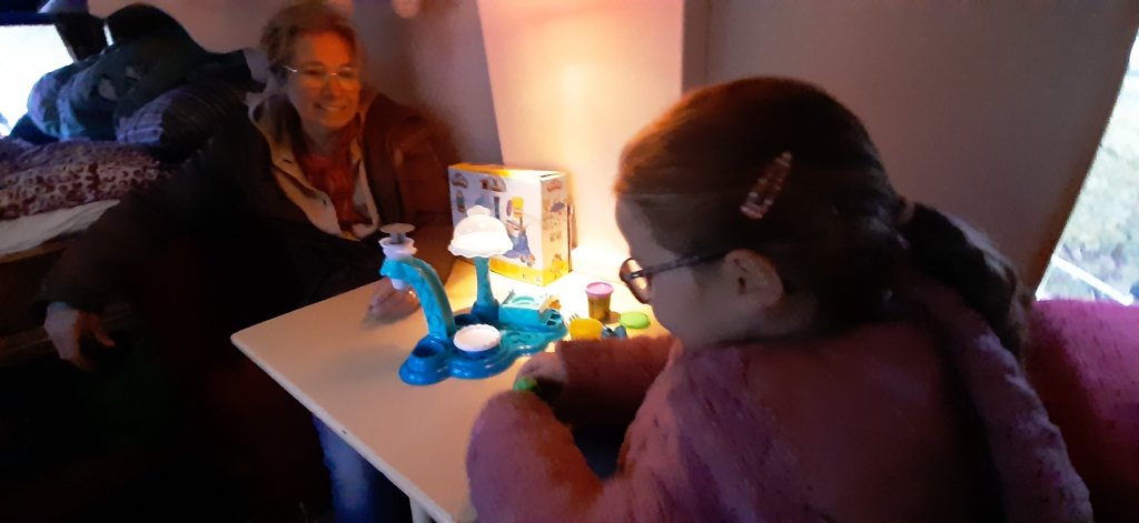 Regen en met de camper en een kleuter weg. Ik dacht: ik kijk vandaag niet verder dan een uur, living the moment. Binnen kleien, Tillie kijkt bewonderend toe: