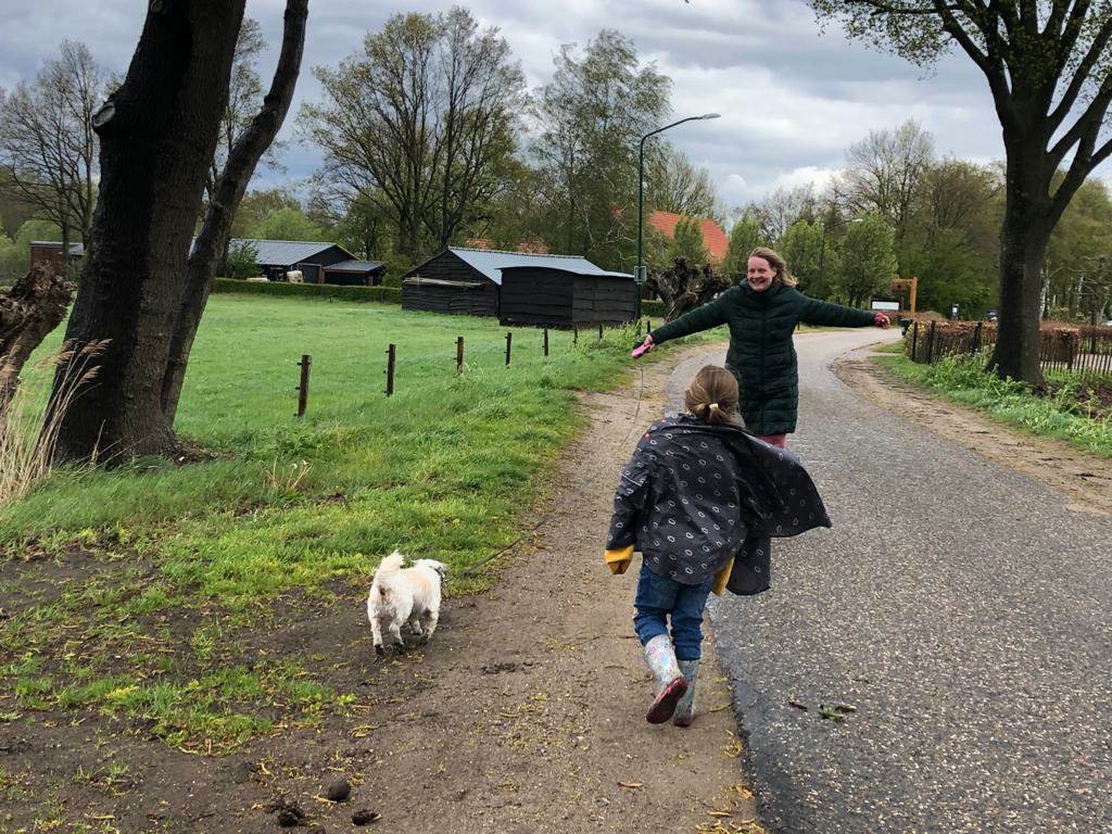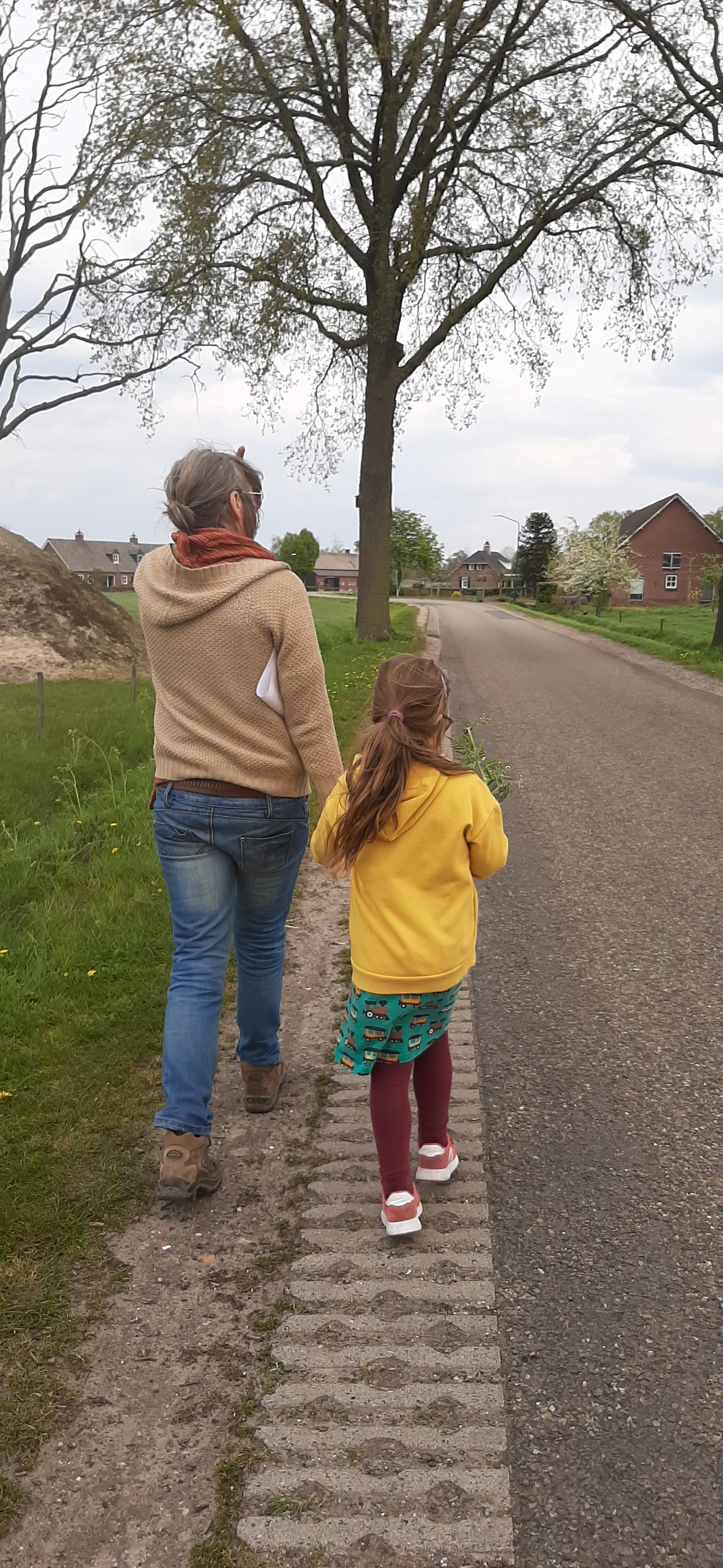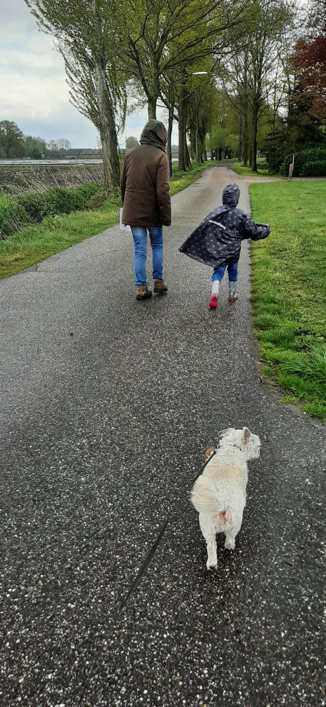 Half 12, gelukkig, de terrassen zijn bijna open. We gaan vast op de fiets. Iets te vroeg komen we aan, het geeft niet. We mogen plaatsnemen, in de regen, we merken het niet meer. Er is niemand, alleen de eigenaar. Hij schuift gezellig aan, merkt ook niks. De huizenprijzen en de politiek zijn nog maar de inleiding van het gesprek, al heel gezellig. Je ziet hem ondertussen onderzoekend kijken naar ons: hoe zit het dan? Een kleuter, twee vrouwen van onbestemde leeftijd in verregende zwerver-look / joggingbroek. Dan, verrassend: “Of ik geen belangstelling heb om in Brabant te komen wonen, is voor kinderen ook heel leuk!” “Want u bent toch de oma?” zegt hij tegen Tillie. Til en ik voelen allebei hetzelfde: tijd om op staan, voor we weer verhuizen moeten. We zeggen allebei, volmondig:”Ja! Oma gaat nog snel even afrekenen, binnen. Daar vraagt de eigenaar aan Til: “Ziet u er nu alleen zo jong uit of bent u het ook?” Tillie wil hem toch tegemoet komen met zijn oma-gedachtes en jokt er 1 jaar bij met haar antwoord: “50!”