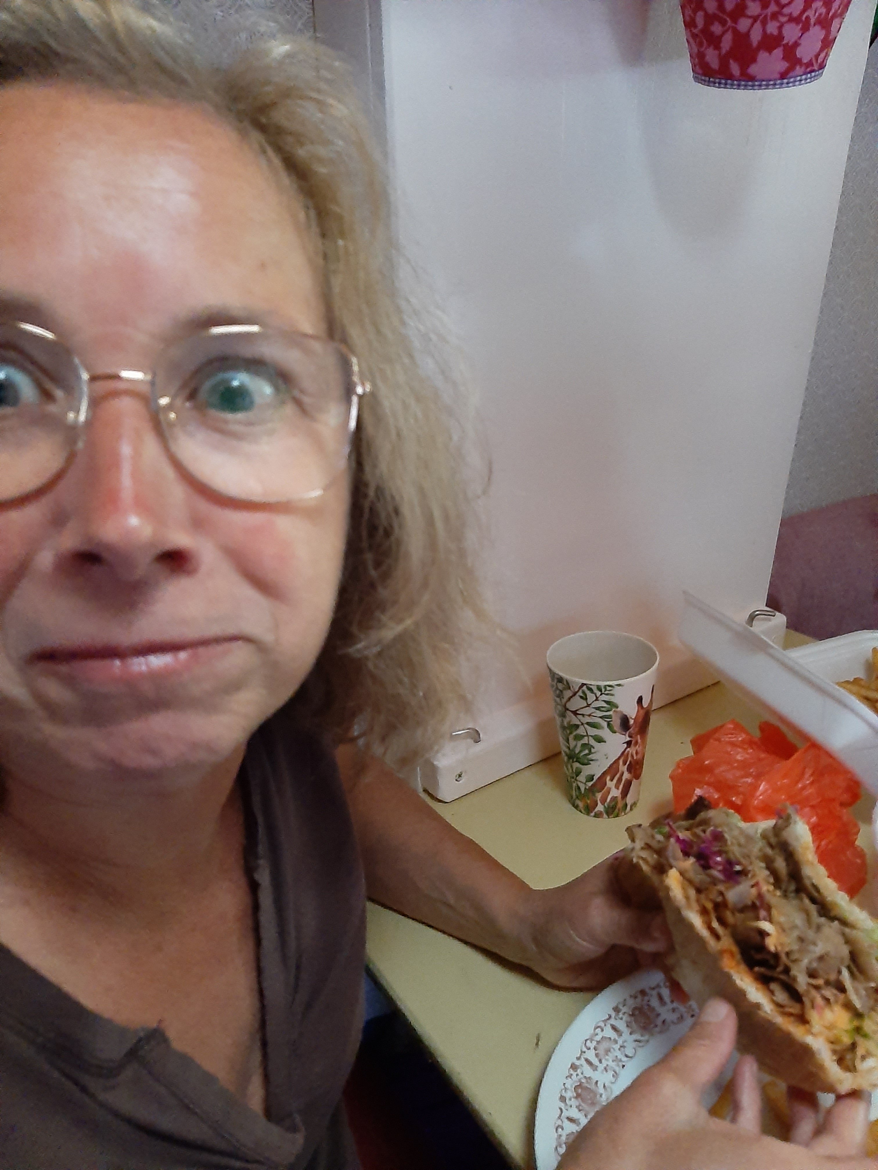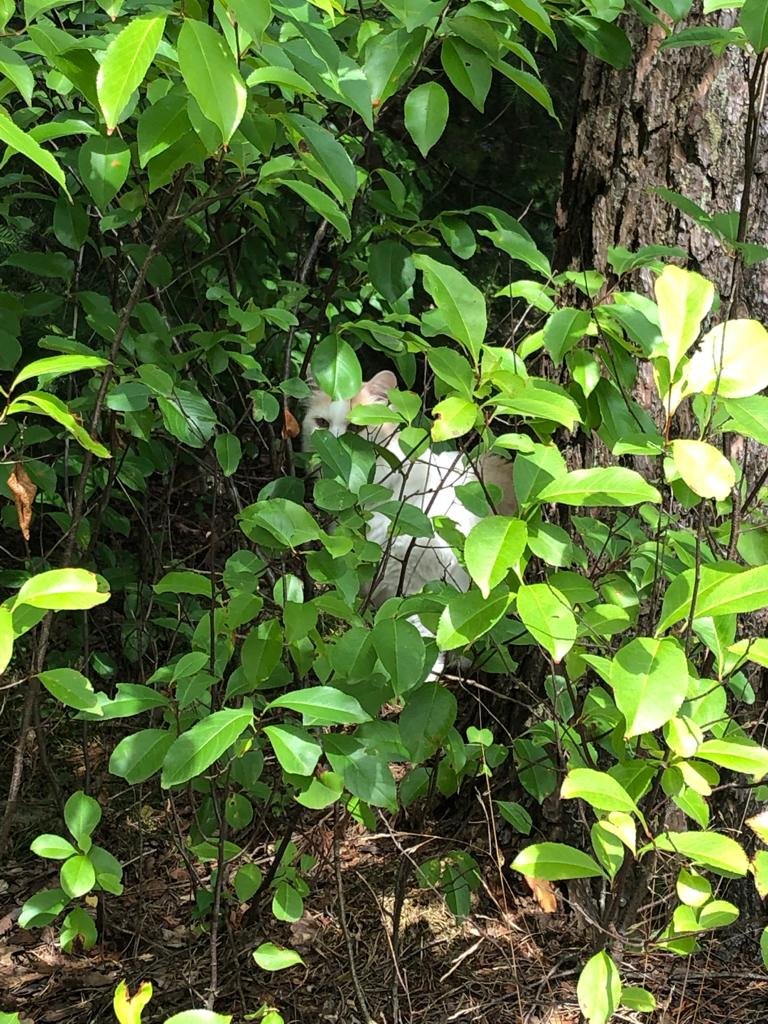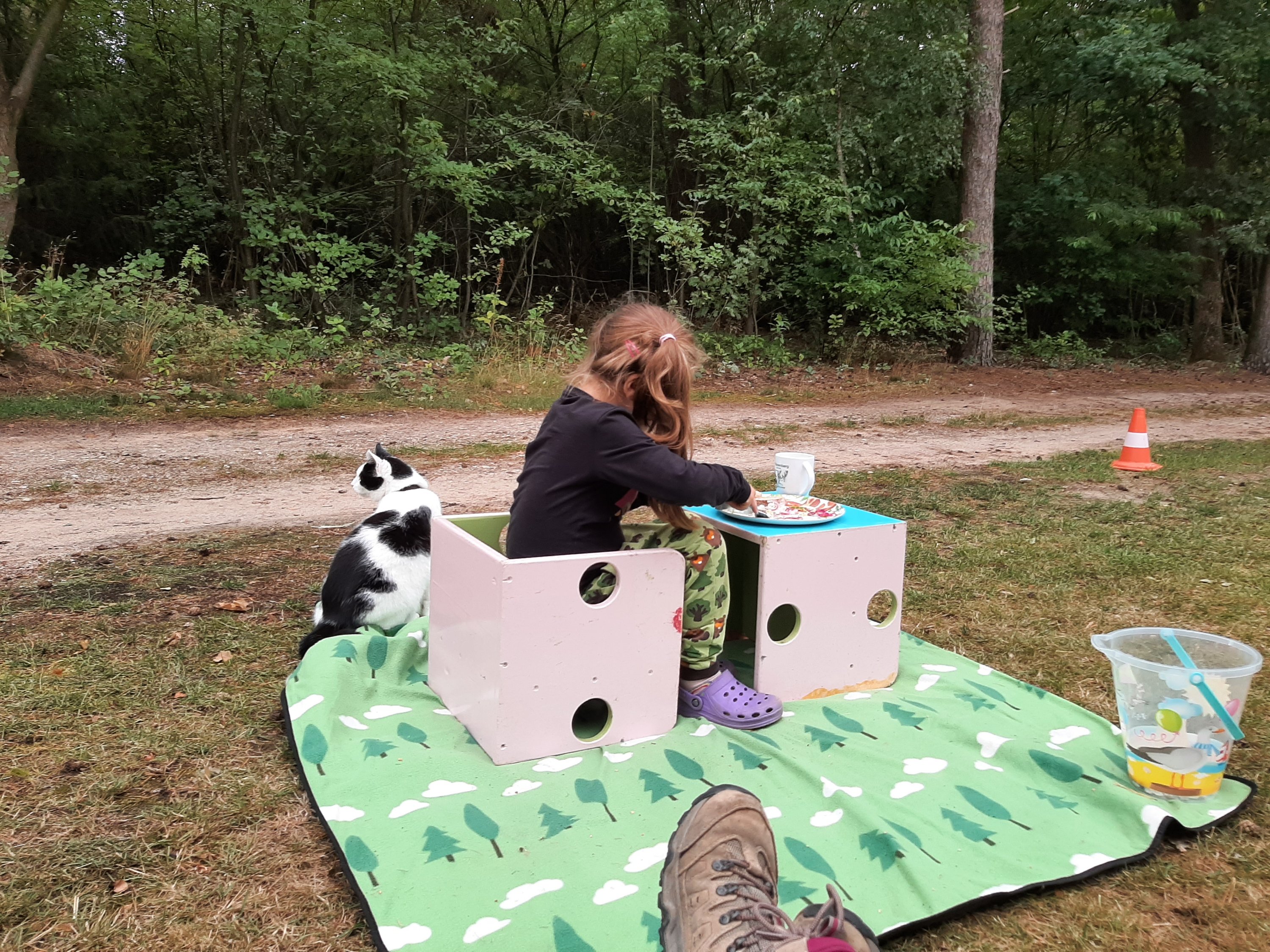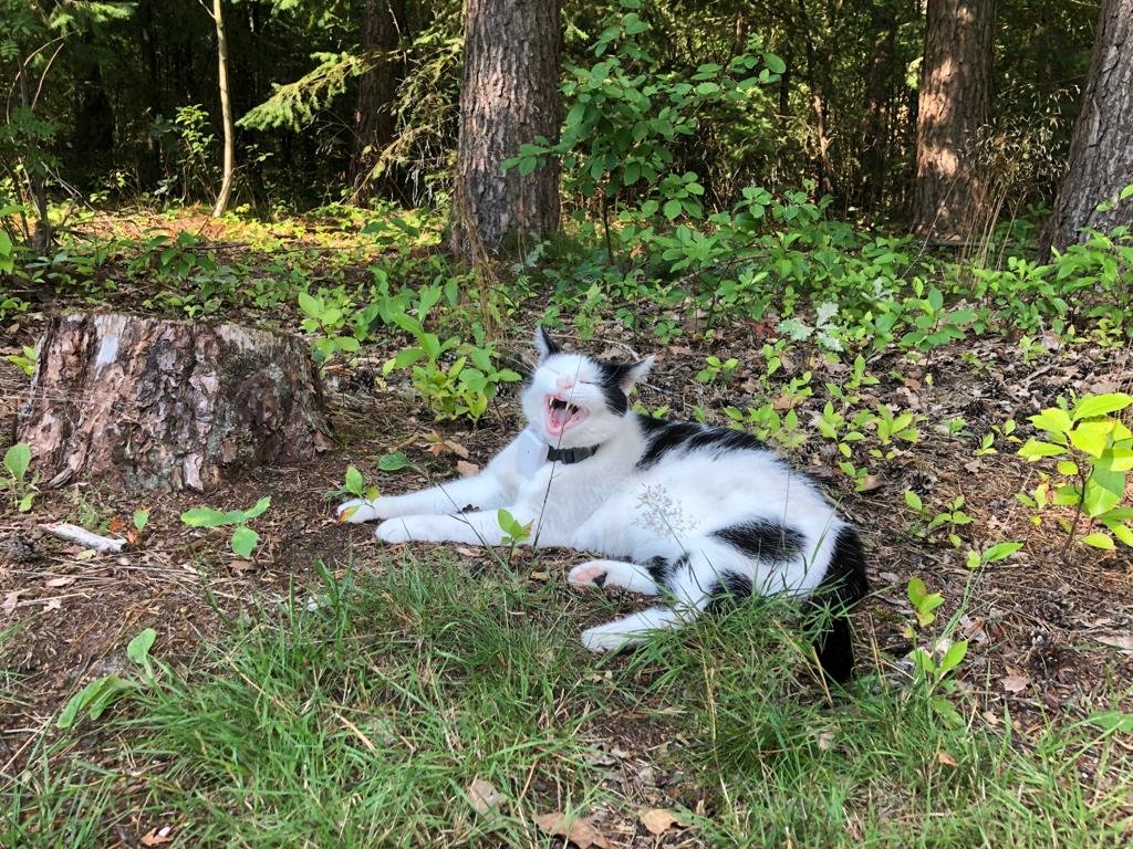 Als we dan zo vredig aan de bosrand zitten, die we uitgezocht hebben omdat zo’n rand zo prachtig dient als kattenpradijs, horen we een hoop lawaai. Een buurman is van zijn stoel gesprongen, onze katten achterna, het bos in, zijn vel uit. Hij blijkt een vogelliefhebber, en nou ja, katten kunnen vogels eten en dat wil hij liever niet. Dan durven de vogels niet meer te komen en kan hij ze niet met zijn camera vastleggen, vertelt hij boven zijn bord waarop een heerlijk ruikend gekruid biefstukje (het zal toch geen kattenvlees zijn, nee…) als ik hem er later die dag over spreek. Ik snap het helemaal en Til had dus al een bestemming voor morgen uitgezocht, precies goed die Mathilda, ze brengt overal rust.
