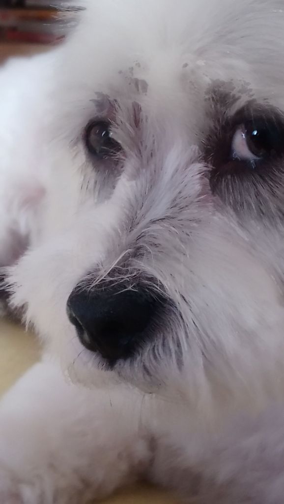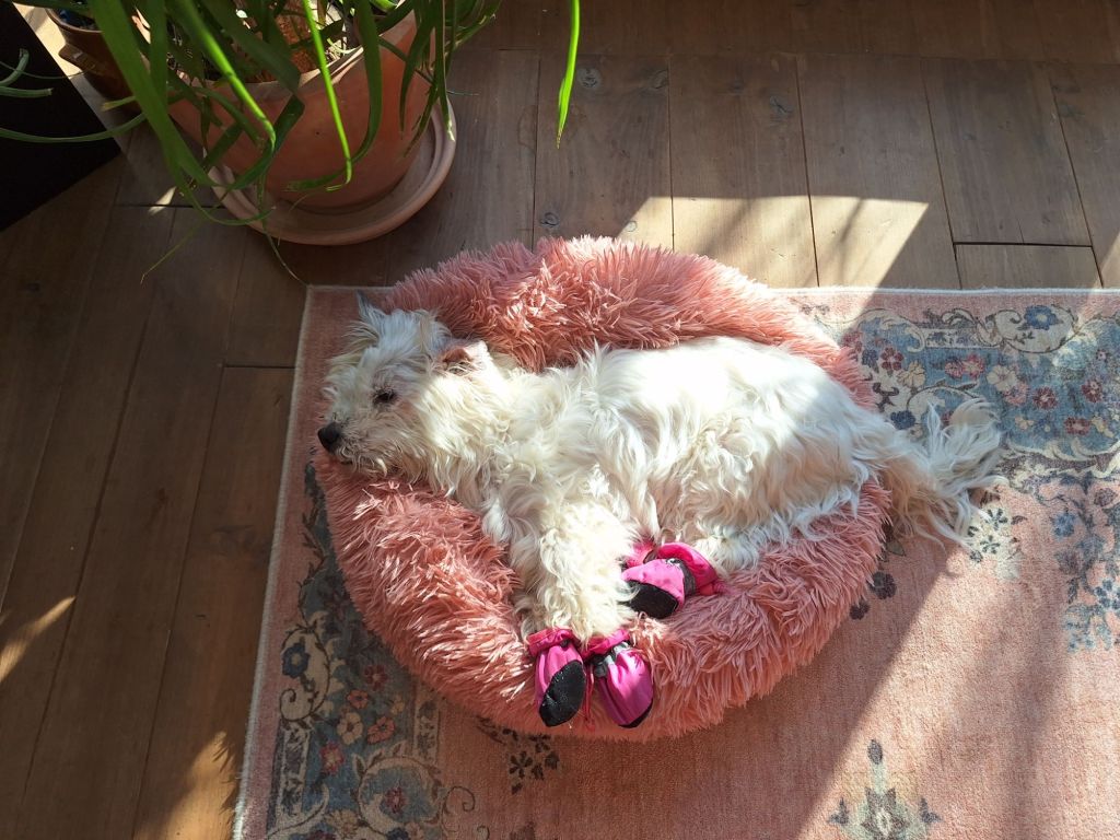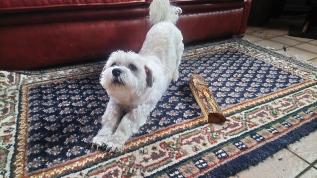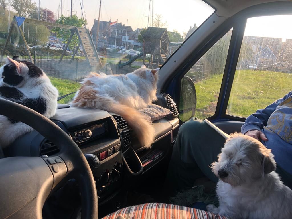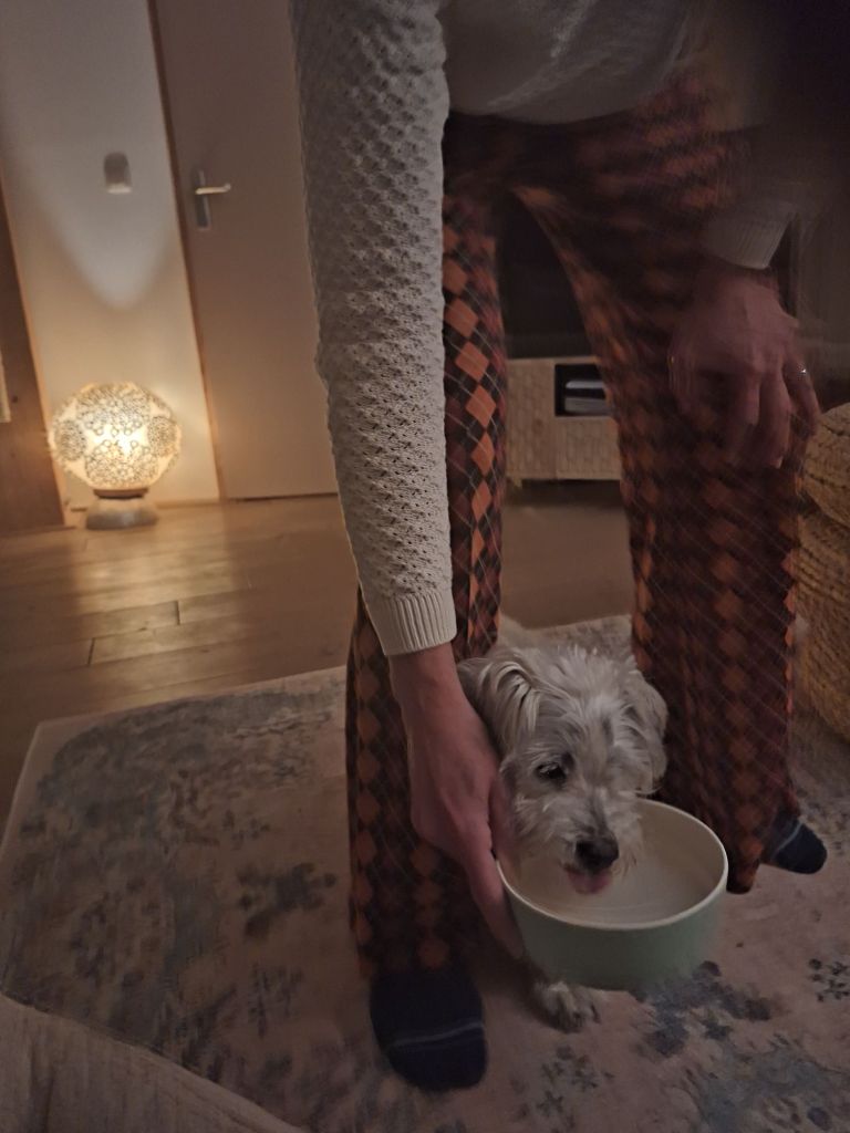 We bespraken bij het wakker worden de situatie, van Ricky. Hij at weinig, drinken gebeurde ook niet veel en hij viel steeds om. Hij was al zo’n anderhalf jaar blind, doof en dement, hij spookte ’s nachts en liep en liep maar door overdag. Nu was hij stilgevallen, mager, vallend, willen opstaan maar niet kunnen. Van zijn geluk geen spoortje te bekennen. We waren het eens, een ongewild prikkie voor Ricky, maandag. Dan hadden we nog 2 dagen met hem.